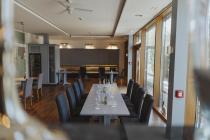 Mit seinen 102 m² bietet Raum 2 großzügig Platz für bis zu 60 Personen und ist ideal für Tagungen, Seminare oder kreative Gruppenarbeiten. Die warme Holzoptik, das angenehme Tageslicht und die klare Raumstruktur sorgen für eine professionelle und gleichzeitig einladende Atmosphäre.